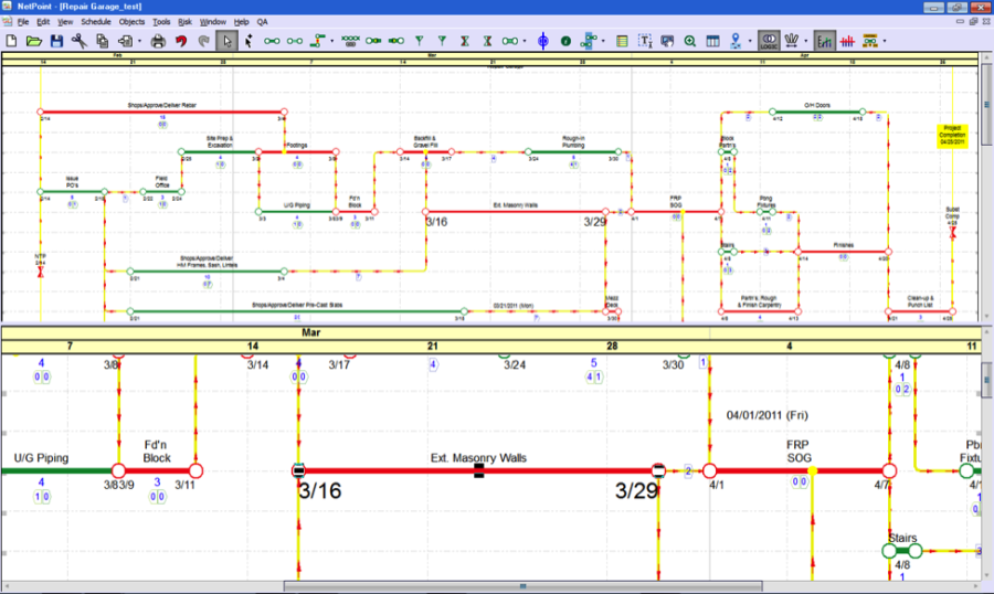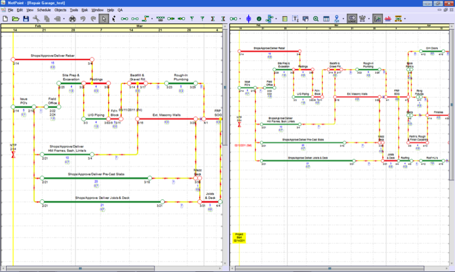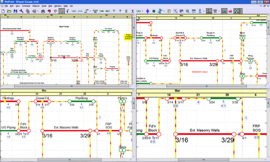 NetPoint allows you to divide each window into more than one canvas for the same schedule. This can be useful when you have a large schedule that can't fit within view all at once. The window can be split vertically, horizontally, or both, the latter of which produces four canvases.