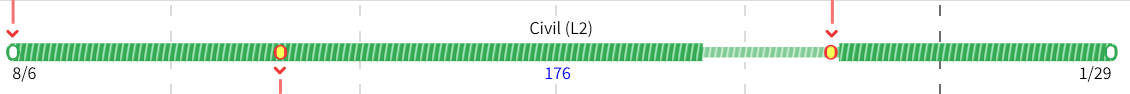 If the summary activity contains a period during which no work took place, then that period of the summary bar is shown using necking. Examples include a period with no logic, a period with logic but not adding float (e.g., a lag or constraint), a period with logic and adding float (e.g., a planned-date or gap), and a non-work period (e.g., a weekend, a holiday, or a shutdown window, etc.).